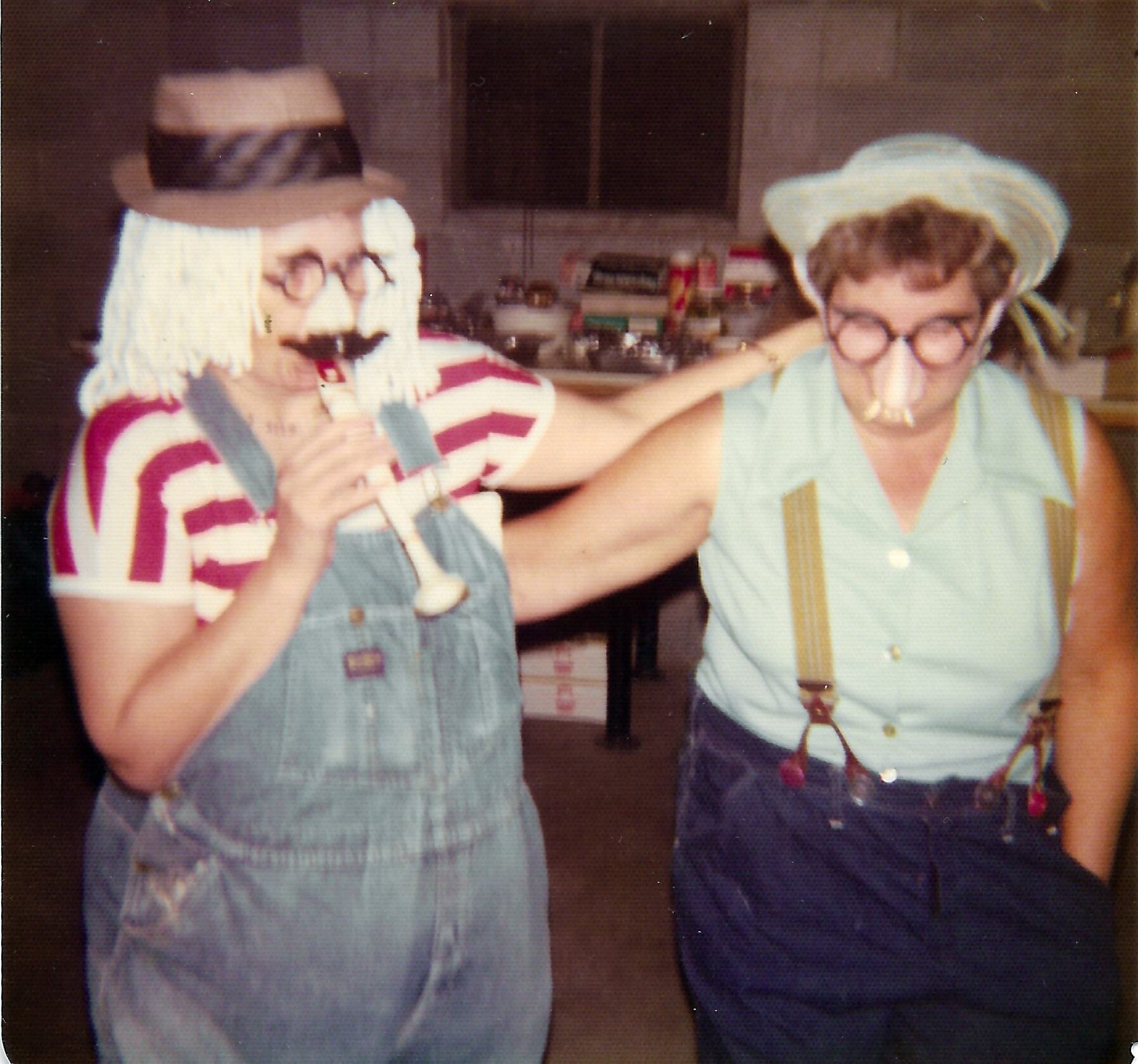 Myrt and sister, Ginny, in Grandpa’s overalls & suspenders, entertaining others for a laugh.